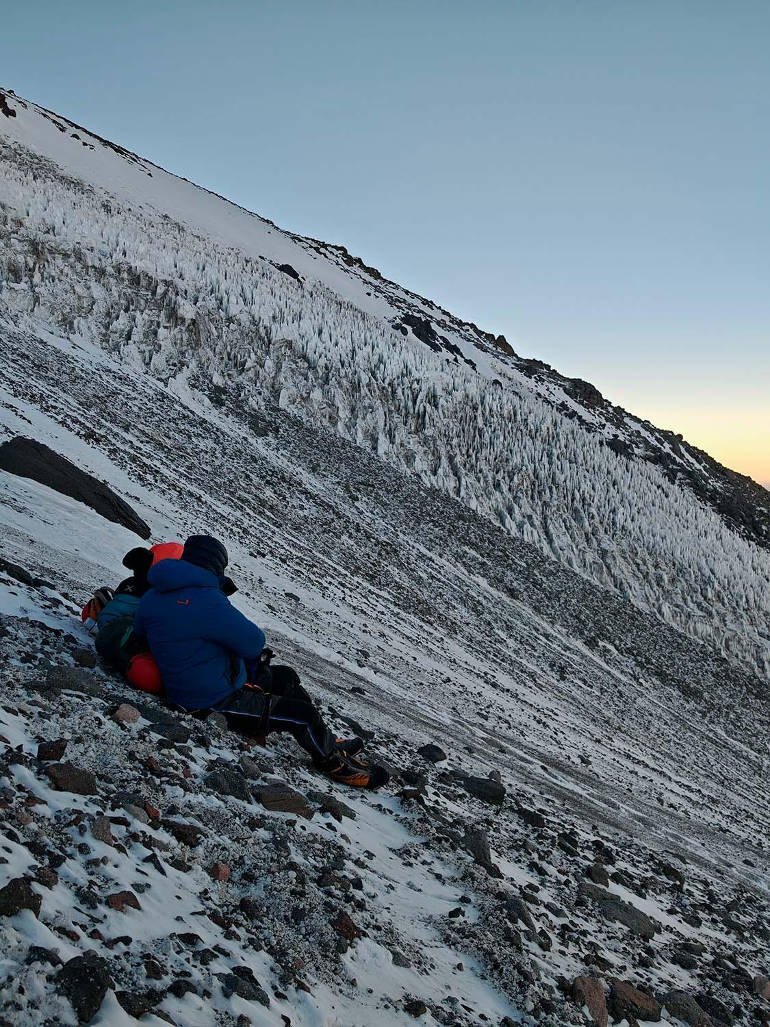 По времени это выглядело так: около 23:00 мы условно «проснулись», а вскоре после полуночи уже были в лагере Атакама. Позавтракали, собрали с собой перекусы. Затем на машинах доехали до лагеря Техос и поднялись немного выше — примерно до 5800 м. Стартовали от точки, куда поднимается транспорт, ориентировочно в начале второго. Наша четвёрка вышла к кратеру около 11:00, а на вершине была примерно в 14:30.