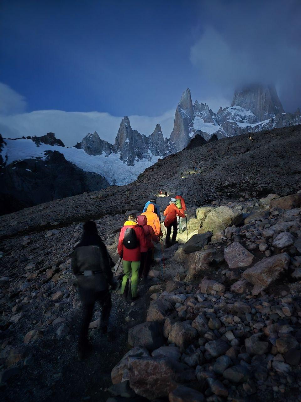 Несмотря на не самый благоприятный прогноз, мы всё равно встали в 4 утра. Быстро вскипятили воду, выпили по кружке чая — и вышли в темноту. Над головой было звёздное небо, а впереди — радиалка к лагуне у подножия Фицроя (Laguna de los Tres): туда мы и шли встречать рассвет.