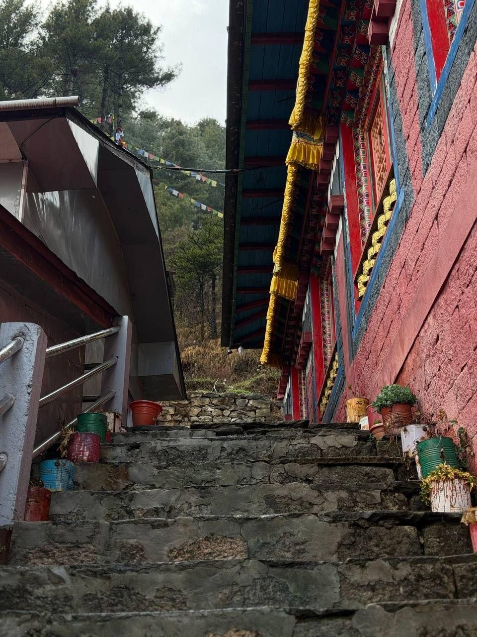 Сидеть в лоджии, конечно, не стали — вышли на прогулку в расположенный рядом буддийский монастырь. Небольшой выход, но именно такие моменты и создают атмосферу трека: тишина, запах благовоний, виды на долину.