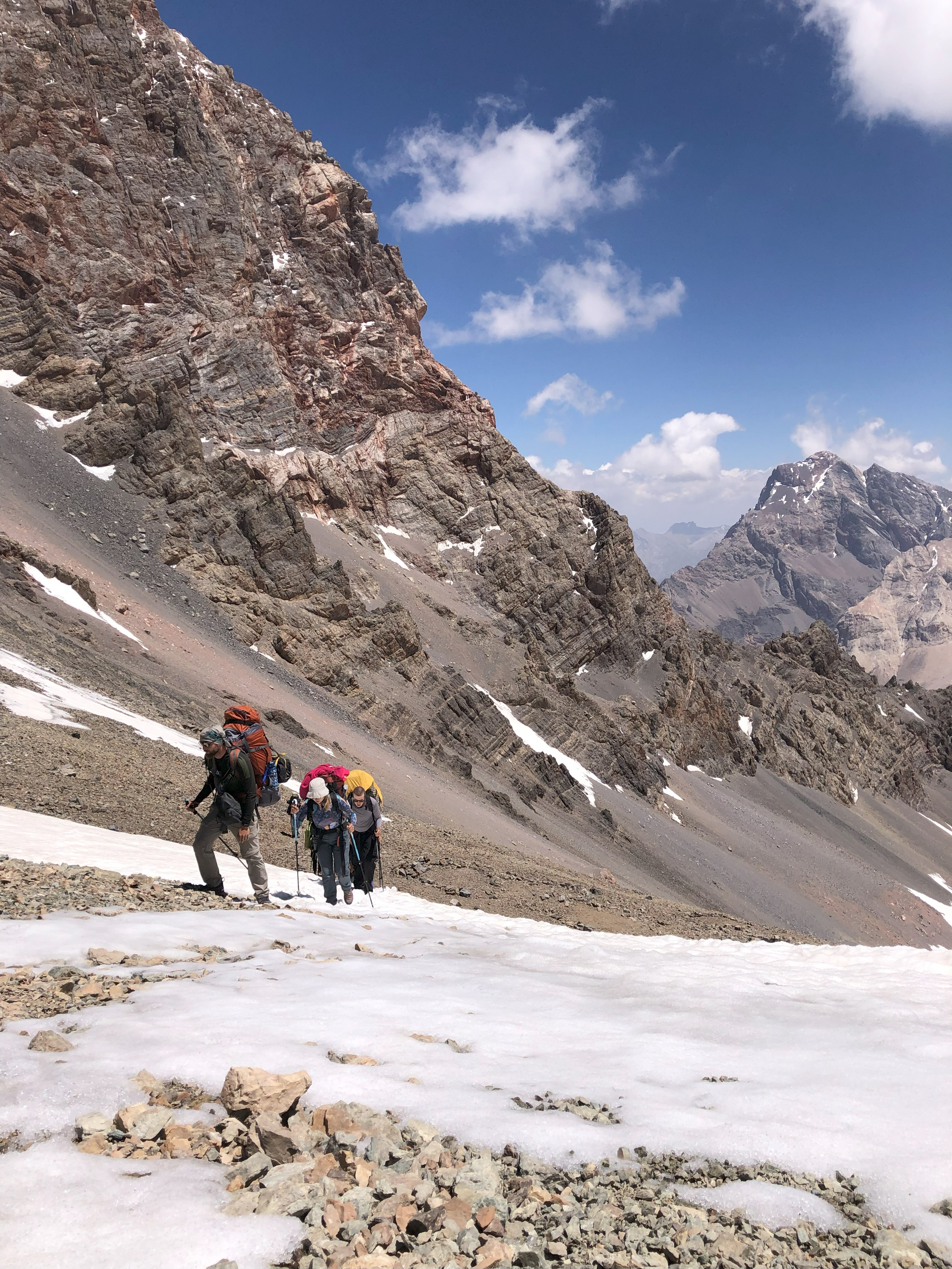 К обеду уставшие, но гордые собой, мы будем стоять на седловине перевале и все Фанские горы будут у наших ног. Перевал Чимтарга является категорийным (высота 4750 м, категория 1Б). Спустившись в долину реки Зиндон, встанем на ночевку на берегу.